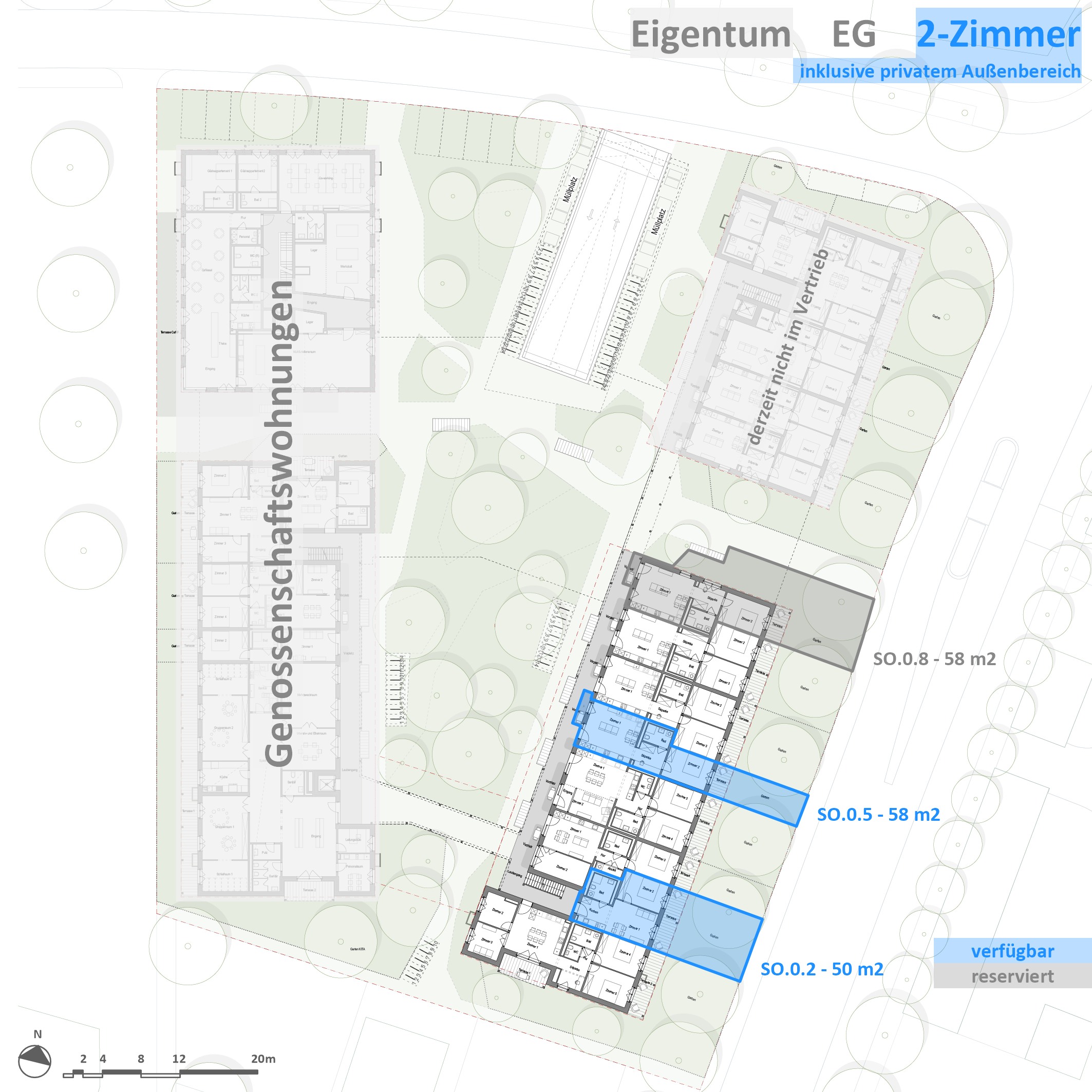 Im Erdgeschoss stehen drei 2-Zimmer-Eigentumswohnungen mit Terrasse und eigenem Gartenanteil zur Verfügung. Zwei dieser Wohnungen verfügen zusätzlich über einen Laubengang. Fast alle Wohnungen im Projekt sind durchgesteckt, sodass viel Tageslicht von zwei Seiten hereinfließt und eine angenehme Luftzirkulation entsteht. Diese Erdgeschosswohnungen eignen sich perfekt für Menschen, die gerne ebenerdig wohnen und den direkten Zugang ins Grüne schätzen.