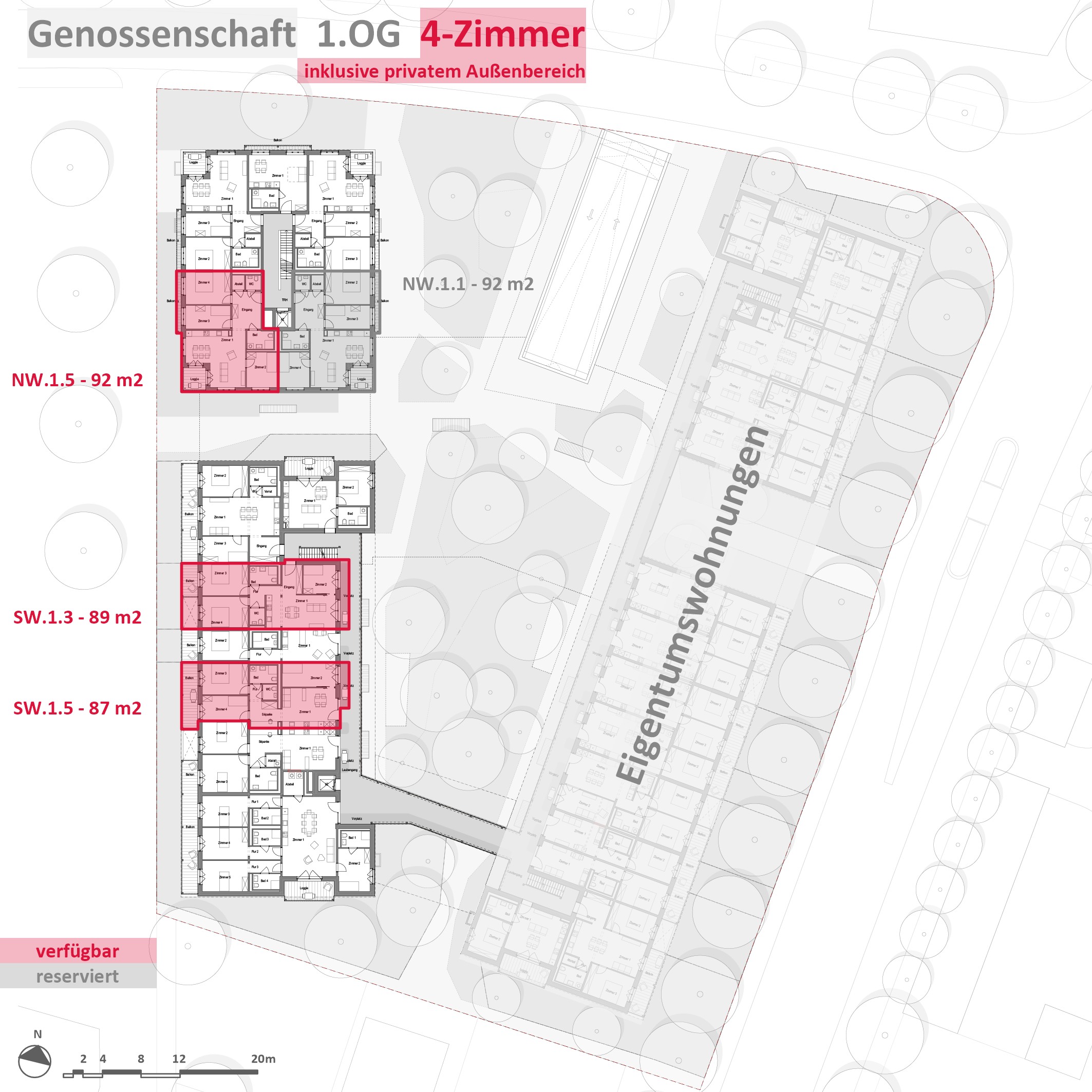 🔍 Rechts sehen Sie den Grundriss des 1. Obergeschosses mit den markierten 4-Zimmer-Genossenschaftswohnungen. Zum Vergrößern bitte auf die Grafik klicken.