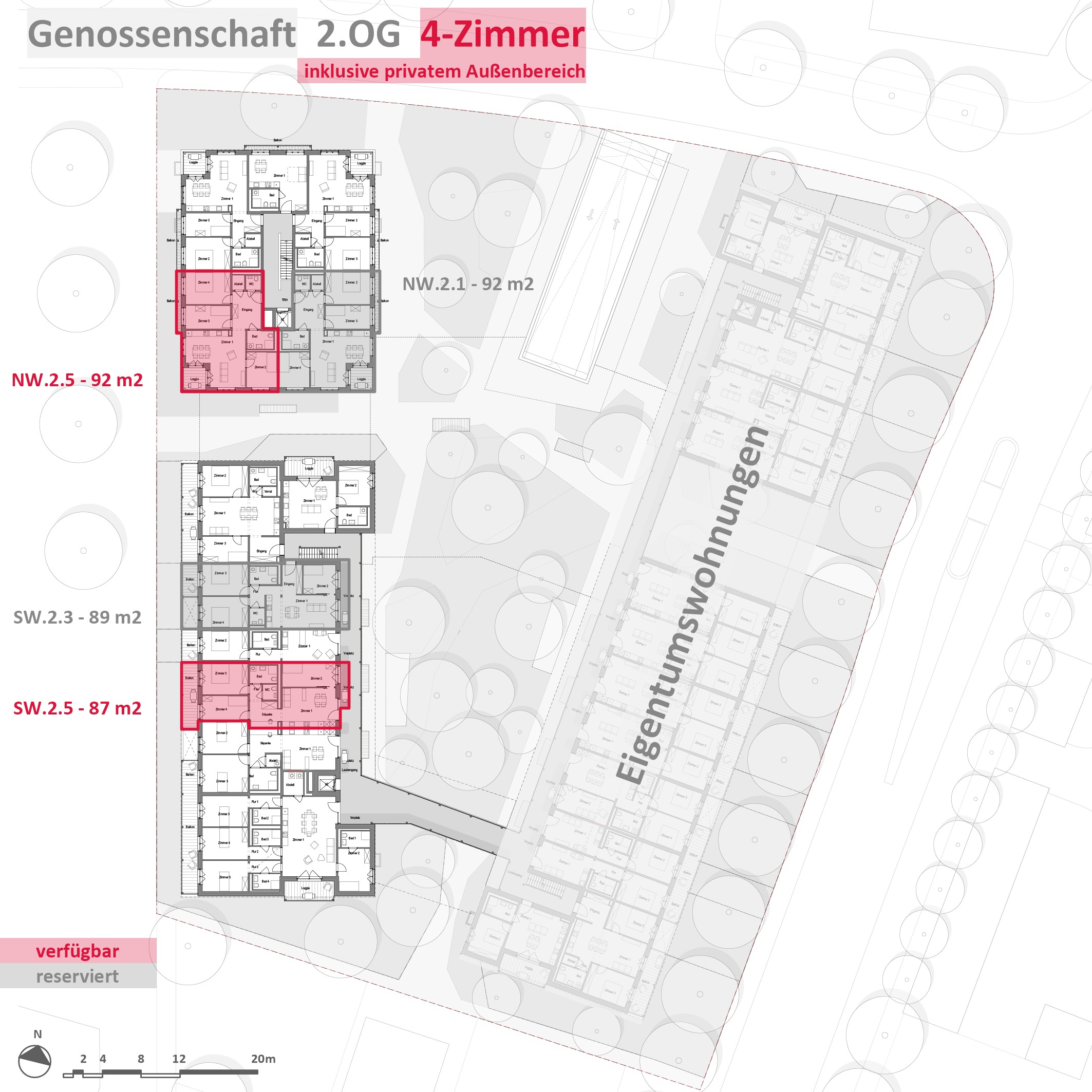 Das 2. Obergeschoss entspricht in seiner Aufteilung vollständig dem 1. Obergeschoss. Auch hier befinden sich im Nordwest-Gebäude zwei nahezu identische 4-Zimmer-Genossenschaftswohnungen mit Balkon und Loggia. Im Südwest-Gebäude liegen zwei durchgesteckte 4-Zimmer-Wohnungen mit Balkon sowie einem Laubengang mit persönlicher Sitzmöglichkeit für Begegnungen, die eine Kombination aus Privatheit und nachbarschaftlicher Anbindung bieten.