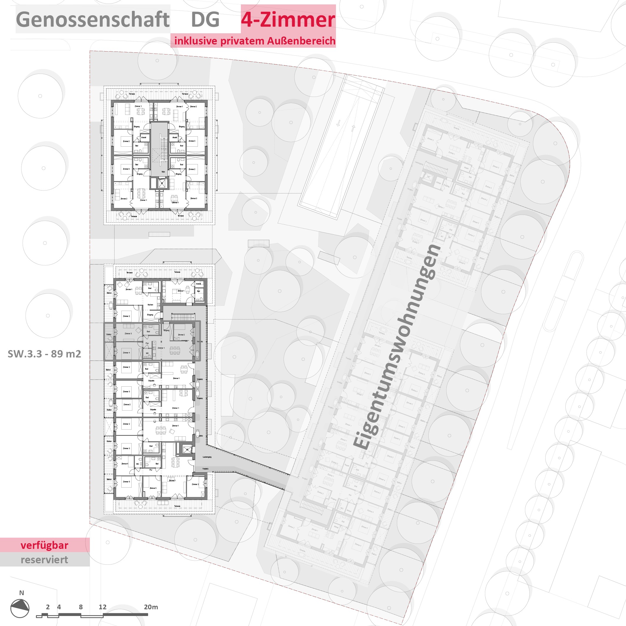 🔍 Rechts sehen Sie den Grundriss des Dachgeschosses mit der markierten 4-Zimmer-Genossenschaftswohnung. Zum Vergrößern bitte auf die Grafik klicken.