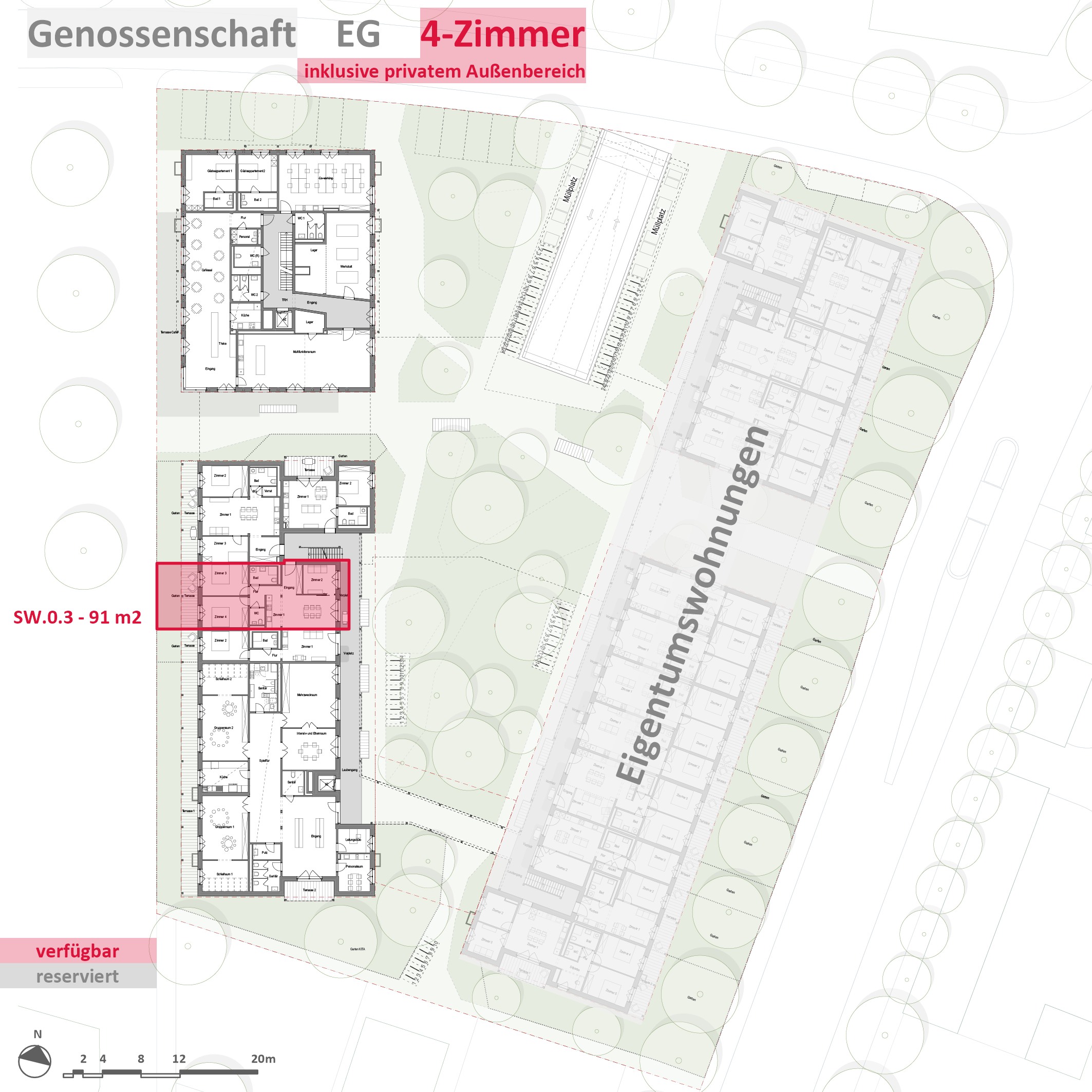 Im Erdgeschoss des Südwest-Gebäudes befindet sich eine großzügige 4-Zimmer-Genossenschaftswohnung mit Terrasse und Garten. Die Wohnung ist durchgesteckt und bietet so eine optimale Belichtung von zwei Seiten. Der große Garten schafft zusätzlichen Freiraum und eignet sich ideal für Familien oder alle, die gern im Grünen wohnen und dennoch die Nähe zu den Gemeinschaftsbereichen des Quartiers schätzen.