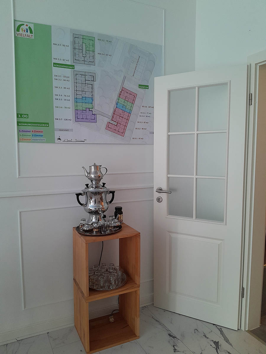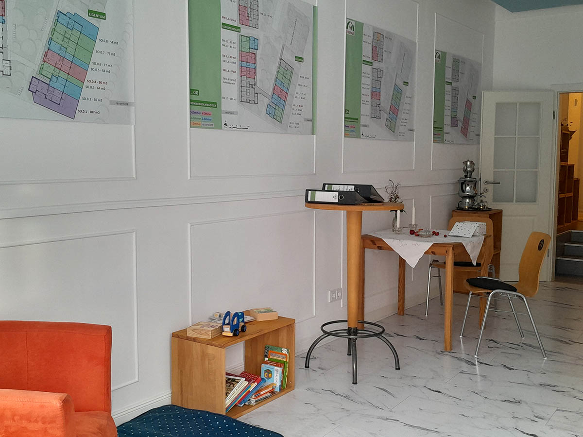 Was heute ein offener, heller Raum mit Infomaterial und Projektplänen ist, begann als gemeinsamer Gedanke zwischen der OEKOGENO und engagierten zukünftigen Bewohner:innen: